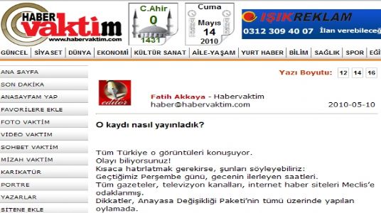 haberinizde vakit gazetesinin fatihini tesbit etmişsiniz. veb fatihi ile bu fatihin aynı kişi olma ihtimali büyüktür. olay şöyle gelişmiş olabilir vakitin fatihi veb fatihindenmetacafeye oradanda haber vaktime servis yapmıştır. ha denilecektirki neden doğrudan doğruya haber vaktimde yayınlanmamıştır? el cevap sanık ne kadar kurnaz olursa olsun bir delil bırakır. şüpheyi haber vaktim den dolayısıylaakp den uzaktutma gayreti var gibi. birde deniliyorki hükümet olarak biz hemenharekete geçtik. bu yanlış hani bir tabir vardır baban kediyi öptükten sonra sen ananı bir kenara bırak. maksat hasıl olmuş ve haber yayılmıştır. metacafe haber vaktim ve video o dakikata bunun yayınlanmasını bekleyen kişi ve kişilerce dünyaya duyurmuşlardır. siz istediğiniz kadar önlenmeğe çalıştık deyin. yayın yapan yer ve bağlantıları gün yüzüne çıktığında (ki zannetmiyorum)birileri müslüman kardeşlerimizin yüzüne bakamıyacaktır.